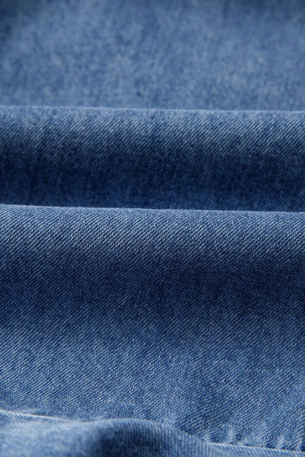Features: V-neckline | Adjustable spaghetti straps | Self-tie belt at waist | Ruffled hem detail | Lightweight chambray fabric | Made from 100% cotton | Machine washable